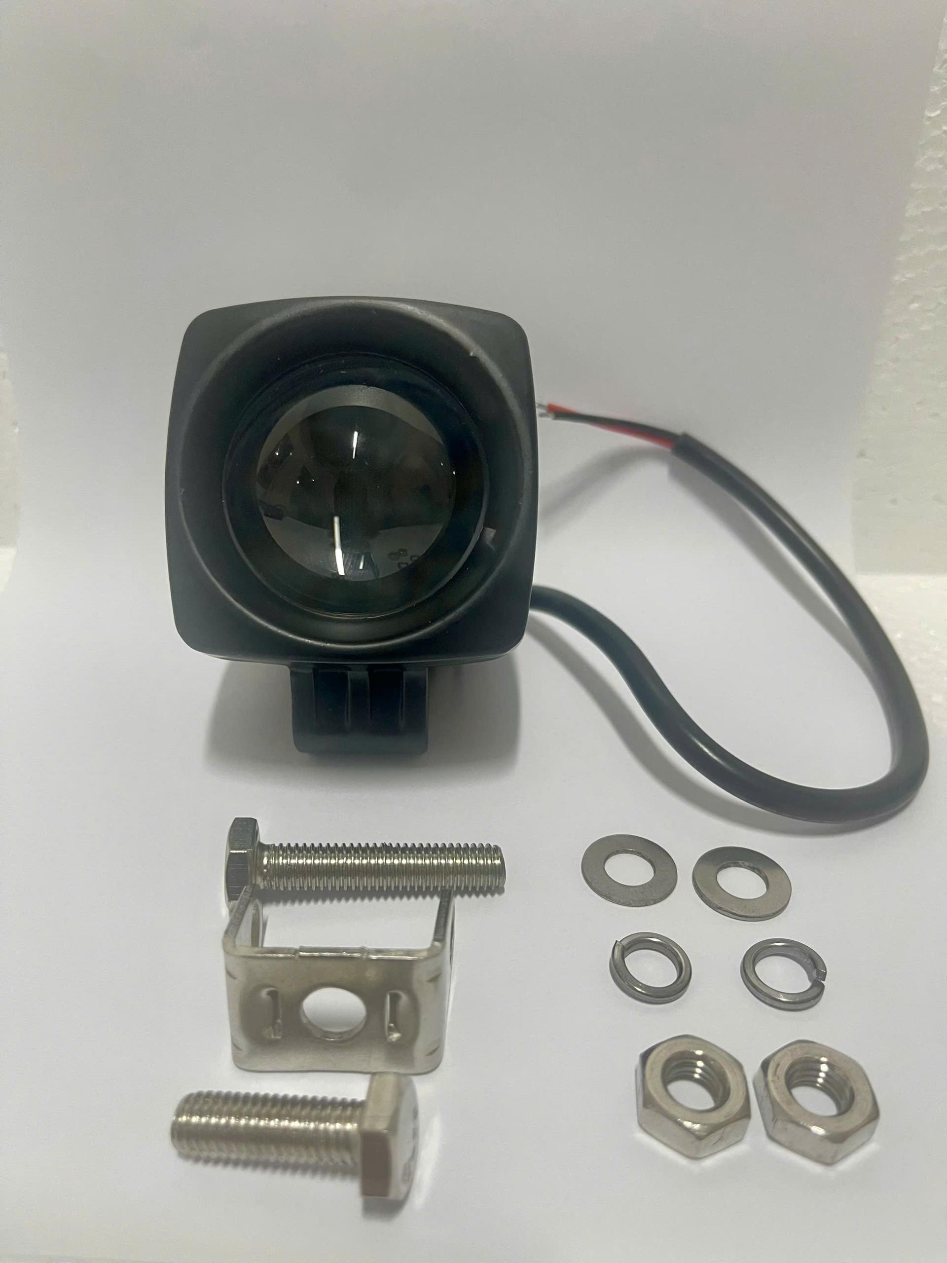 Đèn LED phát ánh sáng xanh cường độ cao, chiếu 1 điểm tròn / oval hoặc vệt ngắn xuống sàn cách xe 3–5 m.